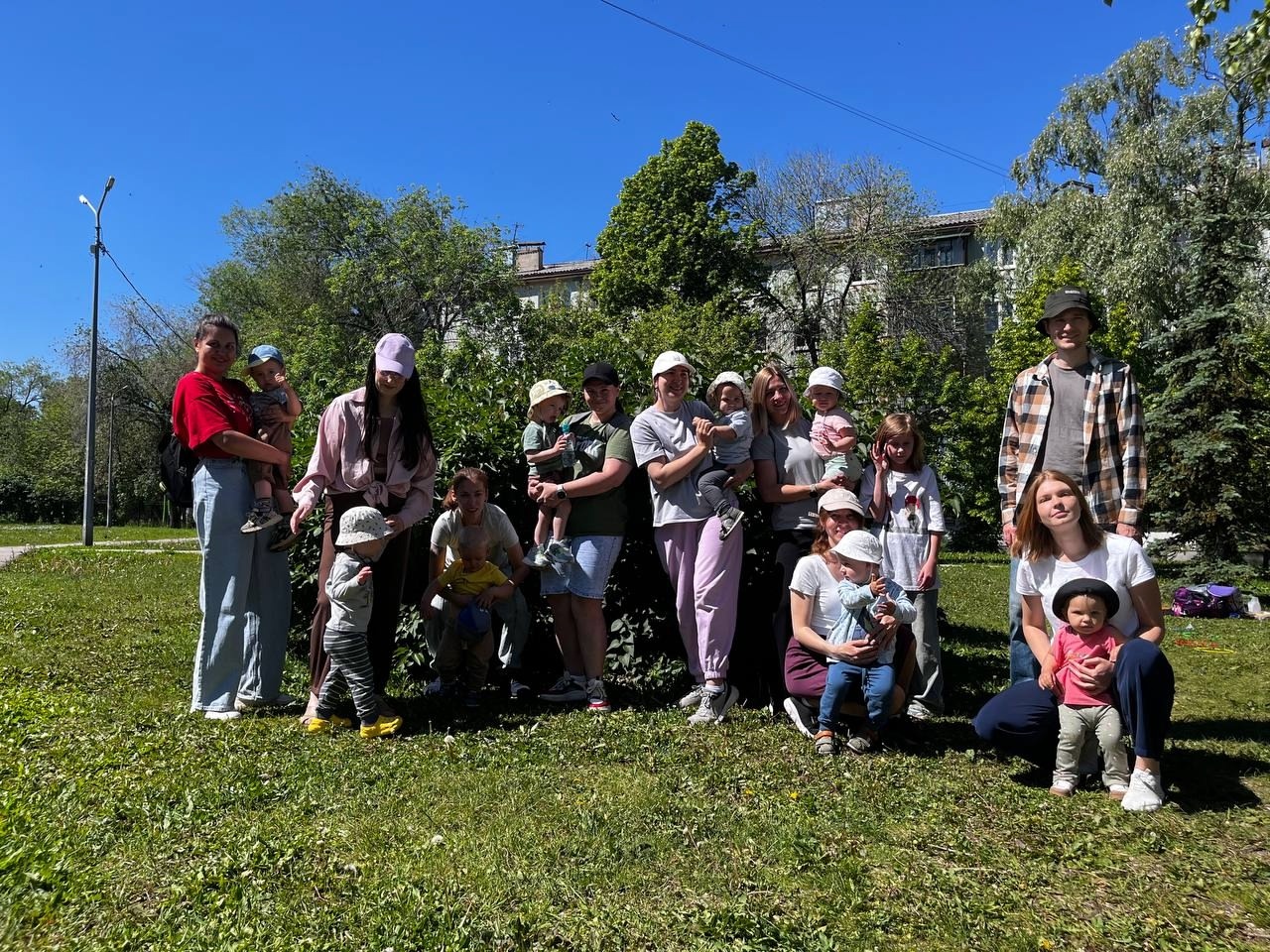 На площадке у круглой клумбы собрались старшие ребята. Было жарко, но не скучно — двигались, общались и дружили. Мамы запаслись водой и головными уборами.